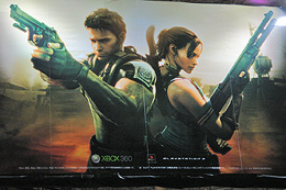 | ▲来春発売予定の「バイオハザード5」をお披露目したカプコンのブースには長蛇の列が。物販コーナーでは関連ウェアが売られていた。 |