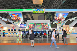 | ▲まずはP業界で唯一公式出展しているSNKプレイモアのブースへ。スロ関連は携帯アプリと『神たま』の展示のみ…!? |