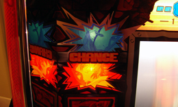続いてゲーム性の面では、チャンス絵柄の出現を契機としたモード移行が大きな特徴となっている。まず基本となるのが2つのステージで構成される通常ステージ。ここでチャンス絵柄が出現すると、30ゲーム継続のRT「バトルロイヤル」へと移行。このモードのラスト5ゲームではバトル演出が発生し、主人公・相川摩季が勝利すれば「チャンスゾーン」へと移行する。チャンスゾーンはART突入まで継続するATとなっており、3択12枚役を完全ナビ。この状態でチャンス絵柄が出現することにより、ARTがスタートするぞ。なお、チャンス絵柄を出現させるには、右リールに赤7の塊を目押しする必要がある。レバーON時に警告音+リール左のランプによるナビが発生するので、見落としには注意しよう。