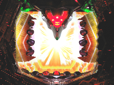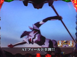 ゲーム性の前に、役モノについての解説をしておこう。エヴァシリーズと言えば盤面に設置された初号機を模った役モノが特徴的だが、本機でもそれは健在。液晶上部に設置された「初号機フェイス役モノ」が目を光らせる、大きく咆哮するなどのアクションを繰り広げ、チャンスを示唆する。そして、液晶両脇には初号機の手を再現した「初号機ハンド役モノ」を新たに搭載。主に連続予告発生時や突発当り時に可動する。特に液晶と役モノが連動し、ATフィールドを切り裂く様を再現した後者のアクションは必見だ。