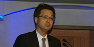 オープニング映像に続き登壇し、発表会の司会を務めた辻よしなりさん。