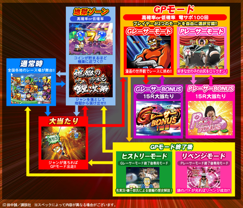 ¡¡Ëܵ¡¤Î³ÎÊÑ¥¹¥Ú¥Ã¥¯¤Ï80¡ó¤À¤¬¡¢½éÅö¤ê»þ¤ËÏ¢¥Á¥ã¥ó¤¬´üÂԤǤ¤ë¡ÖGP¥â¡¼¥É¡×¤ò³ÍÆÀ¤Ç¤¤ë¤Î¤ÏÁ´ÂΤÎ50¡ó¢§GP¥â¡¼¥ÉÈóÆÍÆþ»þ¤Ë°Ü¹Ô¡ÊÄ̾ï»þ¤«¤éľÀܹܰԤ¹¤ë¤³¤È¤â¥¢¥ê¡Ë¤¹¤ë¡ÖÃϹö¥¾¡¼¥ó¡×¤Ï¡¢¡Ö¥Þ¥°¥Þ¡×¡ã¡Ö»³¤ÎÃæ¡×¡ã¡Ö±À¤Î¾å¡×¡ã¡Ö¶Ë³Ú¡×¤Î½ç¤Ë³ÎÊÑ´üÂÔÅÙ¤¬¥¢¥Ã¥×¤·¤Æ¤¤¤¯¢§GP¥â¡¼¥É¤ÏÆÍÆþ»þ¤Î¤ß³ÎÊѤ¬³ÎÄꤹ¤ë100²óž¤ÎÅÅ¥µ¥Ý¥¾¡¼¥ó¤Ç¡¢ÆÍÆþ»þ¤Ë¡Ö£Ç¥ì¡¼¥µ¡¼¥â¡¼¥É¡×or¡Ö£Ð¥ì¡¼¥µ¡¼¥â¡¼¥É¡×¤òÁªÂò¤Ç¤¡¢±é½Ð¤¬¥â¡¼¥É¸ÇͤΤâ¤Î¤ËÊѲ½¤¹¤ë¡£ÂçÅö¤ê¤Î̾¾Î¤â¥â¡¼¥É¤Ë¤è¤Ã¤ÆÊѲ½¤¹¤ë¤¬¡¢ÅÅ¥µ¥ÝÆþ¾Þ¤«¤é¤ÎÂçÅö¤ê¤ÏÁ´¤Æ¤¬15¥é¥¦¥ó¥ÉÂçÅö¤ê¡ÊÄ̾ïÂçÅö¤ê¤Î²ÄǽÀ¥¢¥ê¡Ë¤È¤Ê¤ë¤¾¢§¤Ê¤ª¡¢ÅÅ¥µ¥Ý½ªÎ»¸å¤ËÂںߤ¹¤ëÆÃ¼ì¥¹¥Æ¡¼¥¸¤â¥â¡¼¥ÉËè¤Ë°Û¤Ê¤ë¤â¤Î¤¬ÍѰդµ¤ì¤Æ¤¤¤ë¤¬¡¢ÅÅ¥µ¥Ý¤òÈ´¤±¤¿»þÅÀ¤Ç³ÎÊѤβÄǽÀ¤Ï¤Ê¤¤¤Î¤Ç¤É¤Á¤é¤Î¾ì¹ç¤Ç¤â¨¥ä¥áOK¤À¡£