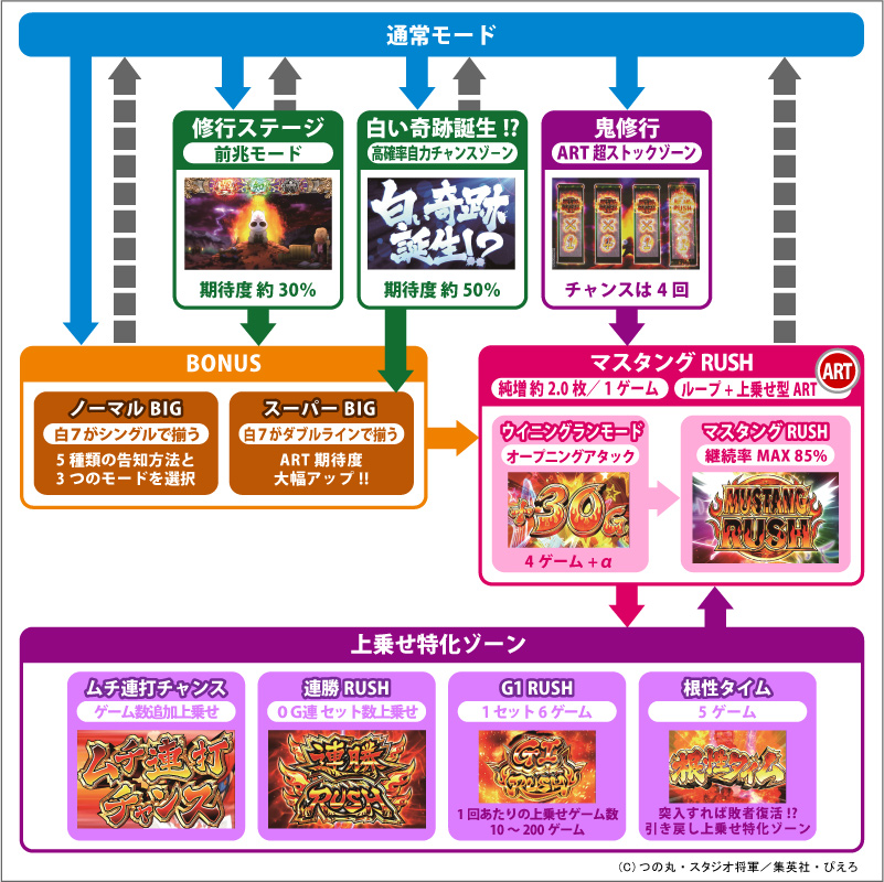 ¡¡¥á¥¤¥ó¤Î½éÅö¤ê¤Ïµ¼»÷¥Ü¡¼¥Ê¥¹¡Ê¡Ö¥Î¡¼¥Þ¥ëBIG¡×¤È¡Ö¥¹¡¼¥Ñ¡¼BIG¡×¤Î£²¼ïÎà¡Ë¤È¤Ê¤Ã¤Æ¤ª¤ê¡¢¤½¤³¤«¤éART¡Ö¥Þ¥¹¥¿¥ó¥°RUSH¡×ÆÍÆþ¤òÌܻؤ¹¤Î¤¬´ðËÜŪ¤Ê¥²¡¼¥à¤Îή¤ì¢§¥Ü¡¼¥Ê¥¹ÅöÁª·Àµ¡¤Ï¡¢¡ÖÄ´»Ò¥á¡¼¥¿¡¼¡×MAX¤ÇȯŸ¤¹¤ë¡Ö¥Á¥ã¥ì¥ó¥¸¥«¥Ã¥×¡×¤Ç¤Î¾¡Íø¤ä¡¢¥ì¥¢¾®ÌòÀ®Î©¤òµ¡¤ËÆÍÆþ¤¹¤ë¡Ö½¤¹Ô¥¹¥Æ¡¼¥¸¡×¤Ç¤Î¾¡Éé±é½ÐÀ®¸ù¡¢¥«¥Ã¥È¥¤¥óȯÀ¸»þ¤Î¥Þ¥¹¥¿¥ó¥°³¨ÊÁ·¤¤¤Ê¤É¿ºÌ¤Ê¥ë¡¼¥È¤¬ÍѰդµ¤ì¤Æ¤¤¤ë¢§¥Ü¡¼¥Ê¥¹Ãæ¤ÎARTÃêÁª¥·¥¹¥Æ¥à¤Ï¡¢¥Î¡¼¥Þ¥ëBIG¤Ê¤é13¼ïÎà¡¢¥¹¡¼¥Ñ¡¼BIG¤Ê¤é£µ¼ïÎफ¤é¥×¥ì¥¤¥ä¡¼¤¬Ç¤°Õ¤ÇÁªÂò¤Ç¤¡¢ÆÈ¼«¤Î¥²¡¼¥àŸ³«¤òºî¤ê½Ð¤»¤ë¤Î¤¬ÆÃħ¤À¢§ARTÆÍÆþ»þ¤Ï¡¢¤Þ¤º½é´ü¥²¡¼¥à¿ô¤ò·èÄꤹ¤ë¡Ö¥¦¥¤¥Ë¥ó¥°¥é¥ó¥â¡¼¥É¡×¤«¤é¥¹¥¿¡¼¥È¡£ART¤Î»Ä¤ê¥²¡¼¥à¿ô¤¬¤Ê¤¯¤Ê¤ë¤È10¡Á11¥²¡¼¥à¤Î¡Ö¥°¥é¥ó¥×¥ê¥ì¡¼¥¹¡×¤¬È¯À¸¤·¡¢¤½¤Î·ë²Ì¤Ç·Ñ³¤«Èݤ«¤¬¹ðÃΤµ¤ì¤ë¢§¤Ê¤ª¡¢Ä̾ï»þ¤Ë¥í¥ó¥°¥Õ¥ê¡¼¥º¤òȼ¤¤BAR¤¬Â·¤¦¤È¥×¥ì¥ß¥¢¥à¤Î¡Öµ´½¤¹Ô¡×¤ËÆÍÆþ¡£ART¥»¥Ã¥È¿ô¤Î£°£ÇÏ¢¾å¾è¤»¤¬£´²óȯÀ¸¤¹¤ë¤¿¤á¡¢ÂçÎÌ¥»¥Ã¥È¿ô³ÍÆÀ¤ÎÂç¥Á¥ã¥ó¥¹¤È¤Ê¤ë¤¾¡£