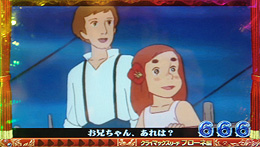 通常時の演出は「フランダースの犬」「母をたずねて三千里」「ふしぎな島のフローネ」の3ステージを移行しながら展開し、滞在ステージによって予告アクションや発展先のリーチアクションが変化。3つのステージが連続で切り替わり、3人の会話が成立すれば突確「マスターピースゲート」に突入する。また、各ステージにはアニメのオープニングソングが当時の映像に乗って流れる「オープニングムービーリーチ」や、最終回の映像に乗って展開する「クライマックス発展リーチ」などが用意されており、ファンなら涙無しには見られない映像と音楽がゲーム展開を盛り上げてくれるぞ。