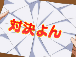 ▲この3on3バトルも学校ステージ専用の連続演出。卓球バトルと同様に、タイトルの文字色や攻撃の順番で期待度が変化するぞ。