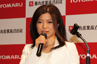 発表会前半の司会役となった豊丸産業株式会社企画本部・山田麻友美氏。新機種の開発に協力した脳科学者・篠原菊紀教授は、ビデオメッセージでの出演となった。