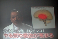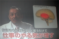 秋葉原UDXシアターにて開催された今回の発表会は、豊丸産業株式会社企画本部・山田麻友美氏の司会により進行され、まずはオープニング映像と脳科学者・篠原菊紀教授からのビデオメッセージが上映された。篠原教授は落ち込んだ時などに活動が低下するとされている線条体の機能について取り上げ、「軽いH感のある新機種を打つと線条体の活動が活発になり、やる気や意欲が更に高まる」と脳科学者ならではのアプローチで新機種の魅力を解説。その後は同社営業本部本部長・永野弘之氏による機種解説を経て、司会はイジリー岡田さんへとバトンタッチされた。