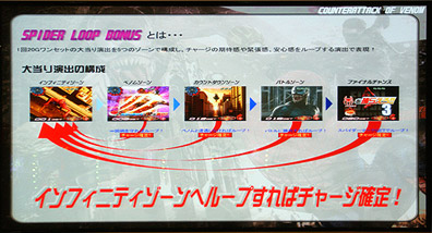 | また、スクリーンでは「スパイダーループボーナス」の具体的な仕様も公開された。大当たりは「インフィニティゾーン」〜「ファイナルチャンス」の全5ゾーンで構成されており、どの段階で「インフィニティゾーン」に戻るかによって出玉が変化するようだ。 |