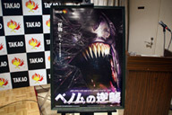 | 最後はフォトセッションが行なわれ、ベノムを想起させる黒い衣裳に身を包んだコンパニオンにフラッシュが焚かれた。 |