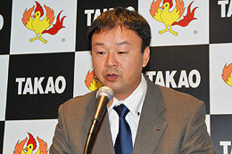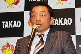 | プレス発表会は株式会社高尾代表取締役副社長・内ヶ島隆寛氏(写真左)の主催者挨拶でスタート。実機の除幕を経て、同社広報担当・河津哲也氏(写真右)が新機種プレゼンテーションを行なった。 |
